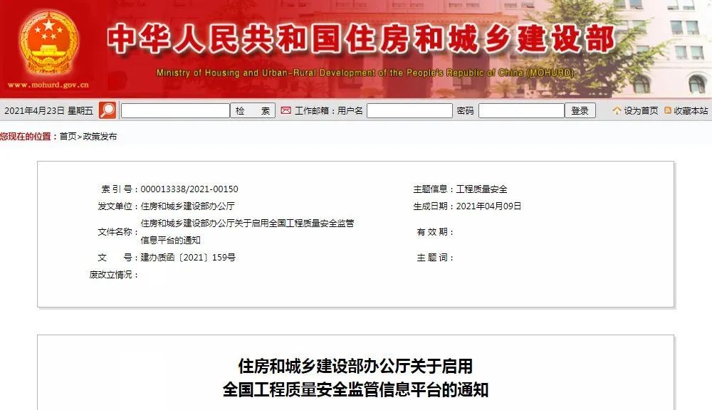 住建部:5月15日起,正式啟用全國工程質量安全監(jiān)管信息平臺!